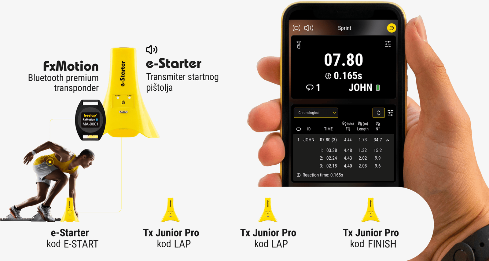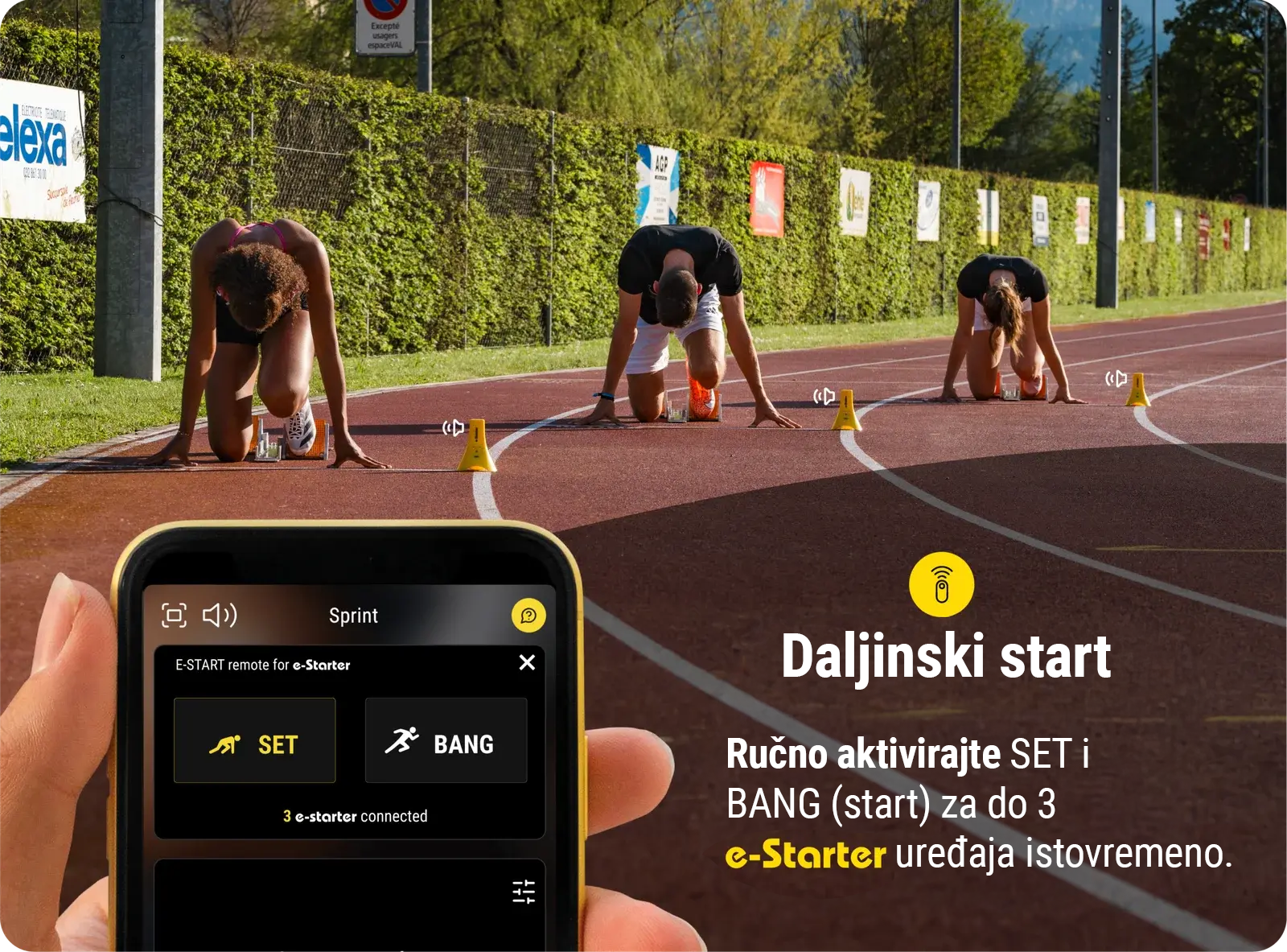 e-Starter ima zvučnik koji emituje SET komandu, nakon čega slijedi BANG (zvuk pucnja).
