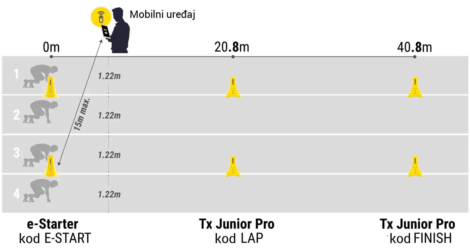 *Za optimalnu preciznost, postavite Tx Junior Pro transmitere 80 cm NAKON željene distance (jer vaš čip detektuje transmiter 80 cm prije njegove stvarne pozicije).